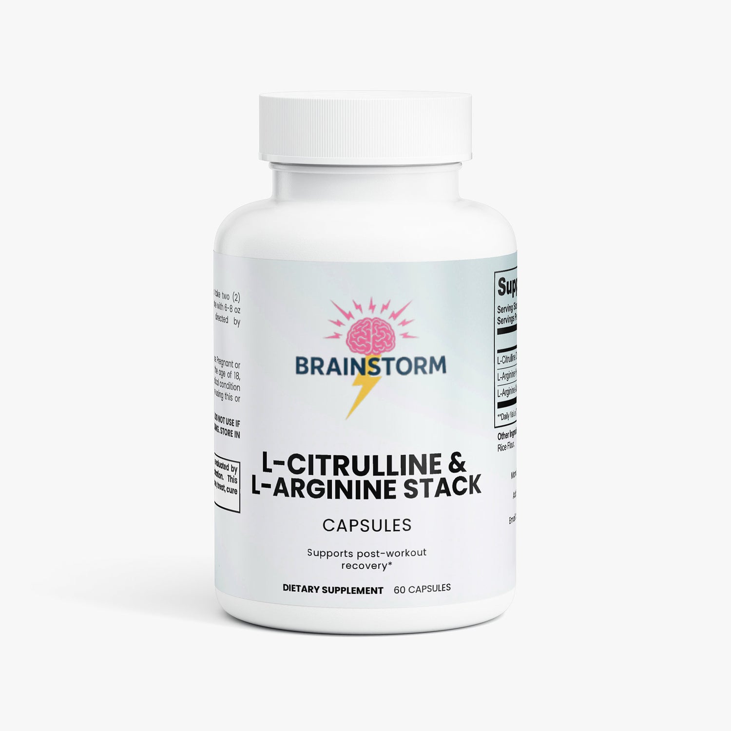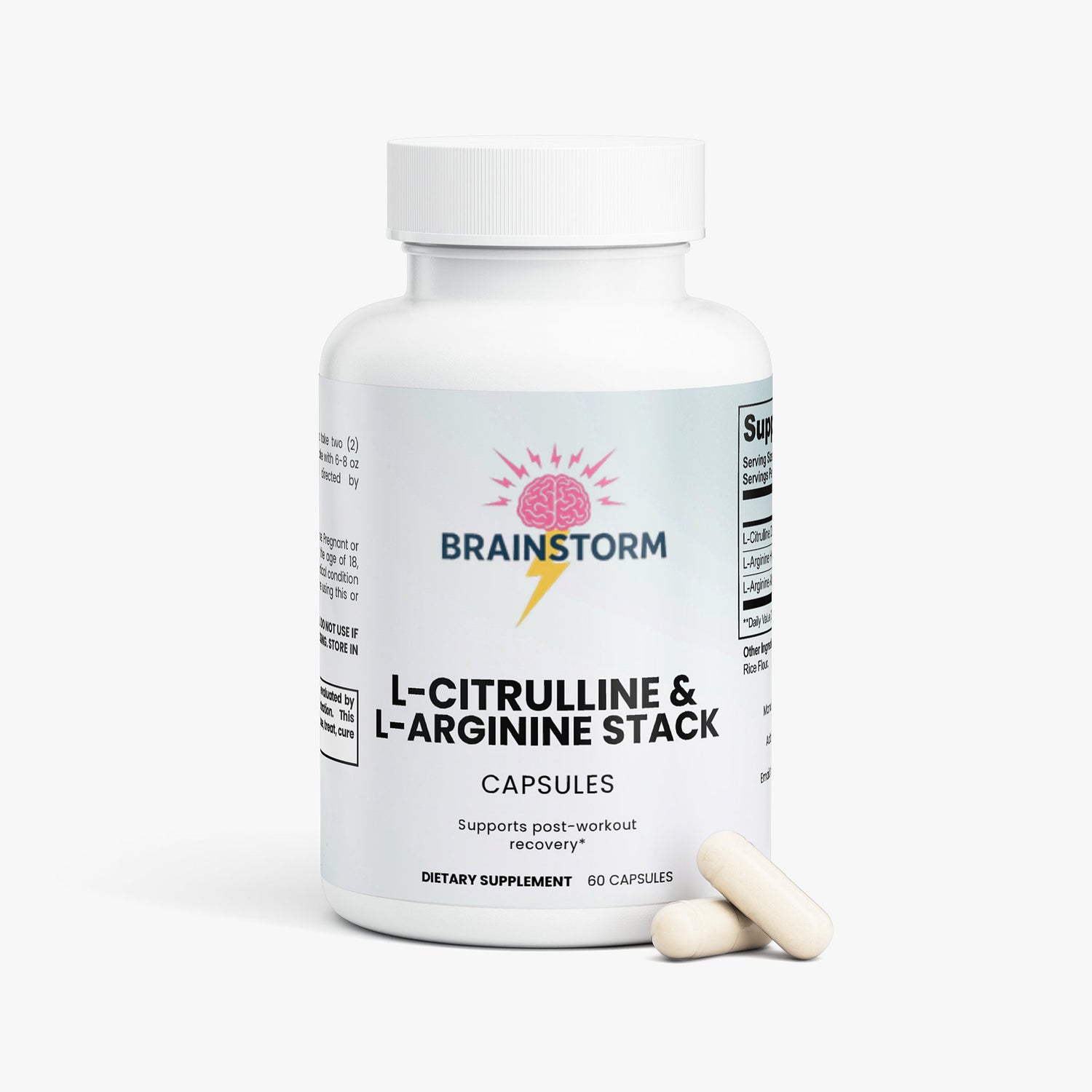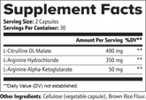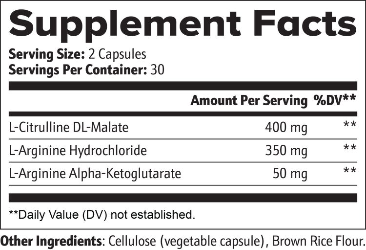Ingredients: L-Citrulline DL-Malate (400 mg), L-Arginine Hydrochloride (350 mg), L-Arginine Alpha-Ketoglutarate (50 mg), Vegetable Cellulose (Capsule), Brown Rice Flour.