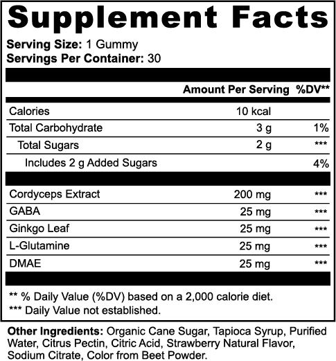 Ingredients: Cordyceps Extract (200 mg), GABA (25 mg), Ginkgo Leaf (25 mg), L-Glutamine (25 mg), DMAE (25 mg), Organic Cane Sugar, Tapioca Syrup, Purified Water, Citrus Pectin, Citric Acid, Strawberry Natural Flavor, Sodium Citrate, Color from Beet Powder.