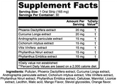 Ingredients: Pullulan, Pheonix Dactylifera extract, Curcuma Longa extract, Andrographis paniculate extract, Cichorium intybus extract, Vitis Vinifera extract, Phyllanthus Niruri extract, Phyllanthus Emblica extract, Cellulose, Mannitol, Licorice extract, Lecithin, Malic acid, Mango Flavor, Steviol glycosides, Orange flavor